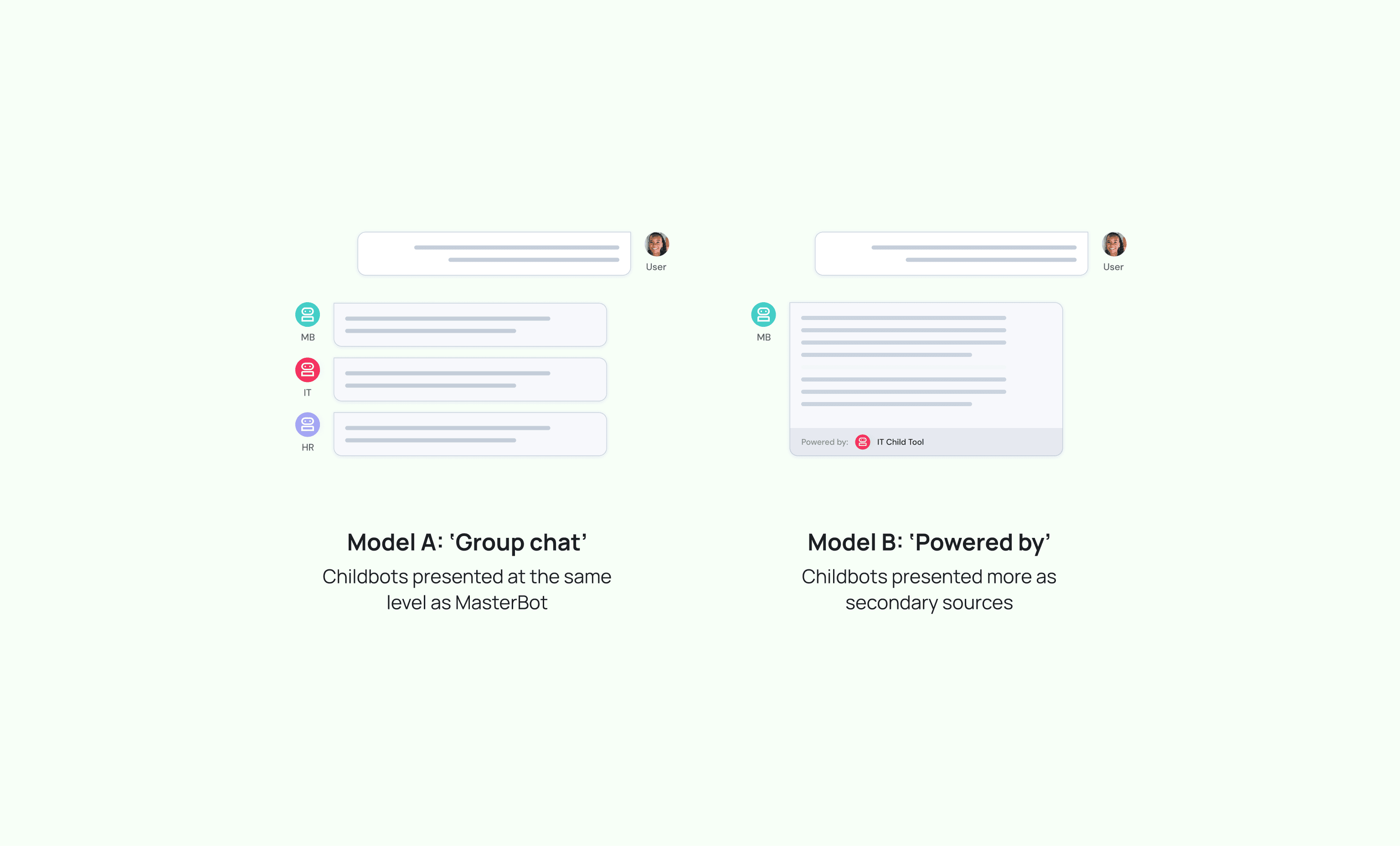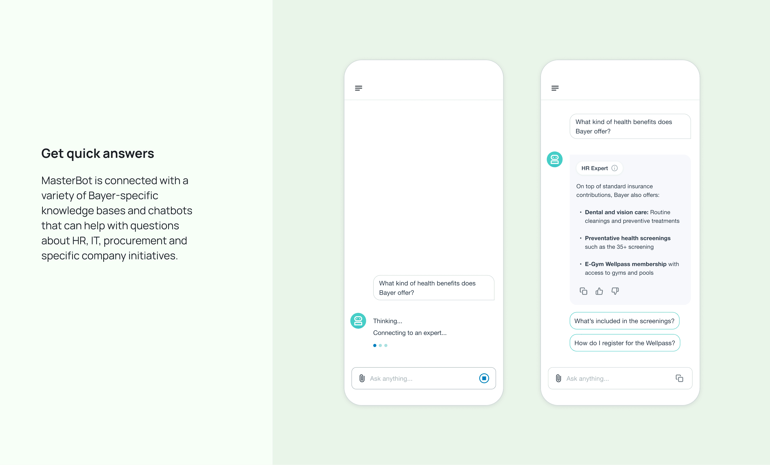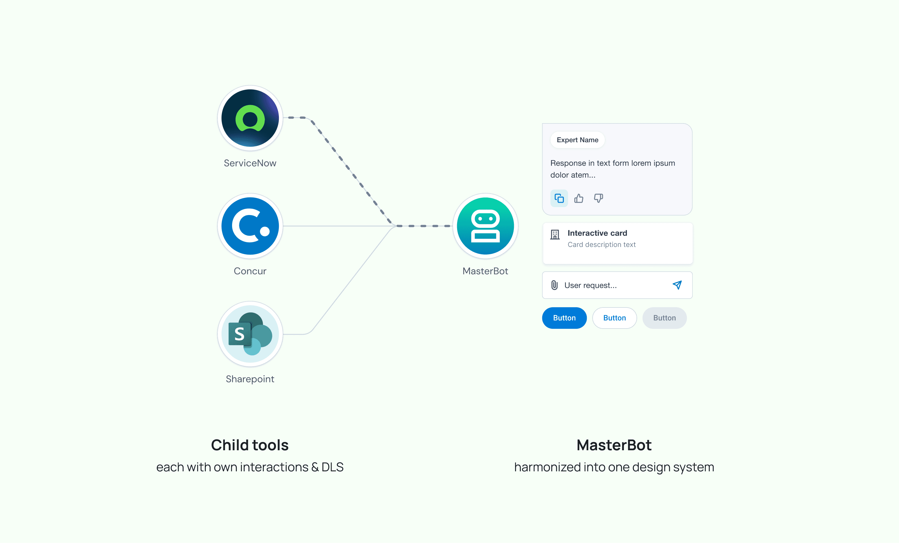One of the biggest questions was how to visualize MasterBot’s role as a childbot orchestrator (not an all-knowing agent). Bayer wanted employees to understand this mental model in order to highlight the scaleability of the platform. We tested multiple mental models and decided to present connected childbots/tools as domain "experts" that took a secondary position in the UI, but reinforced the concept of MasterBot as an agentic orchestrator.