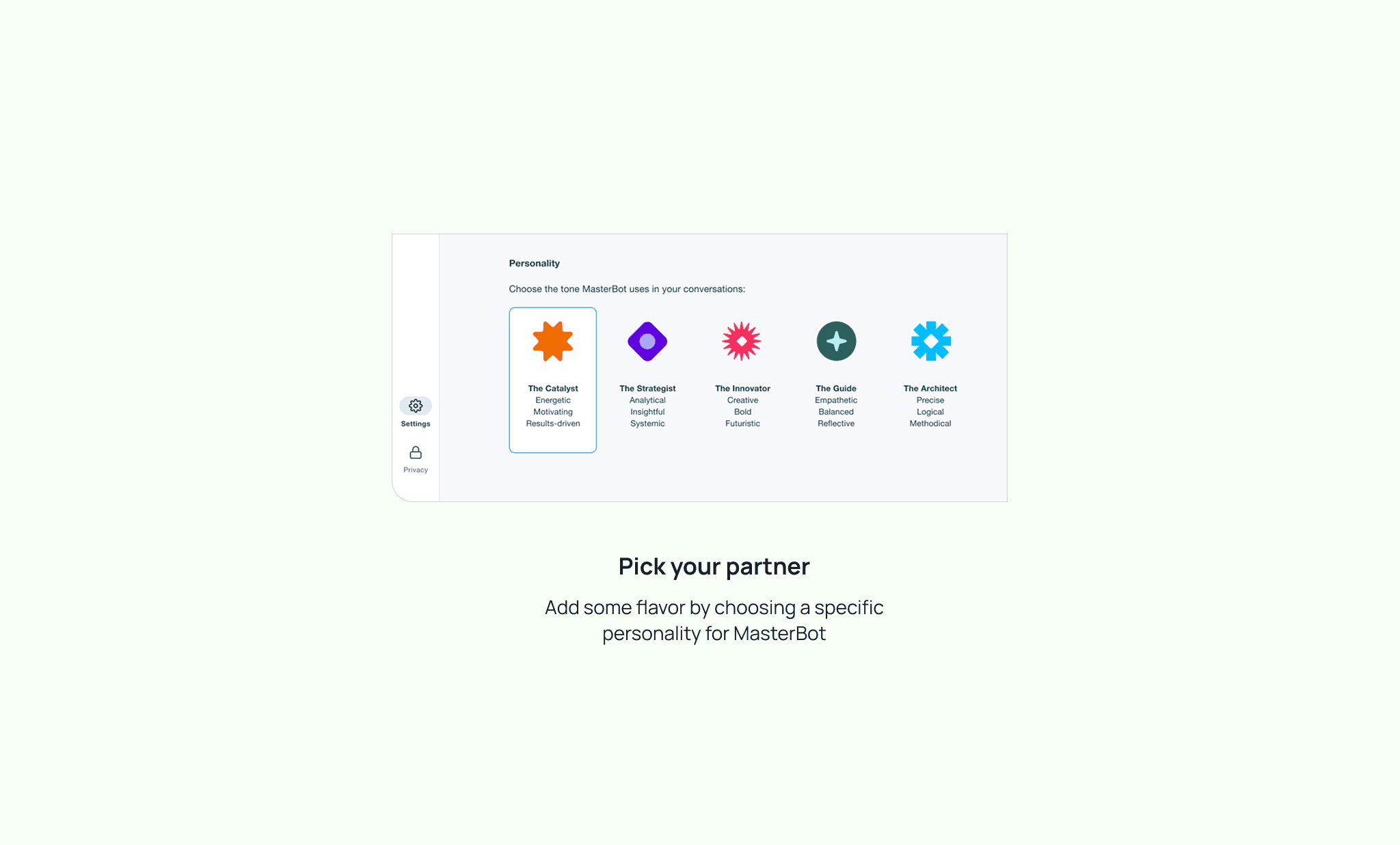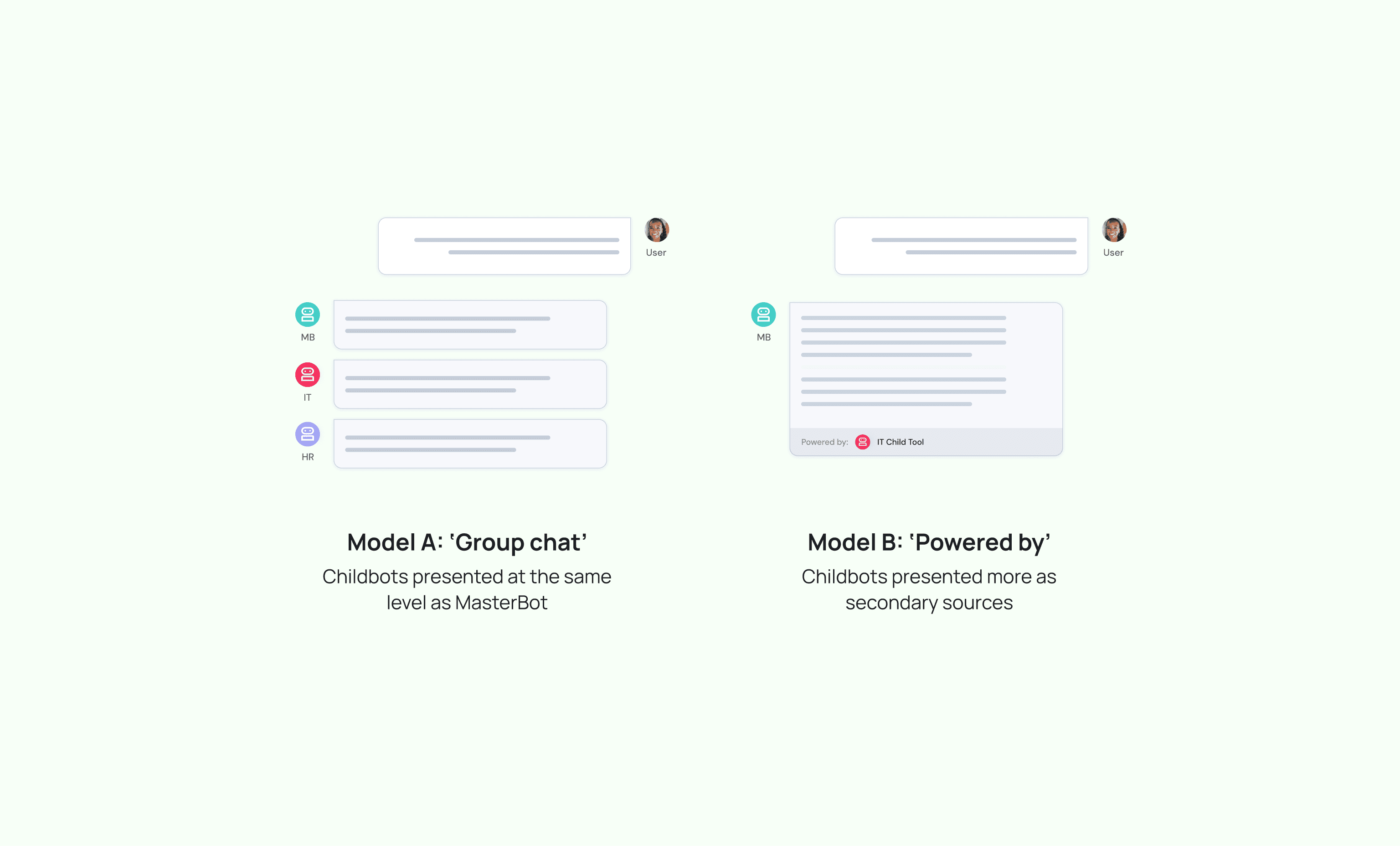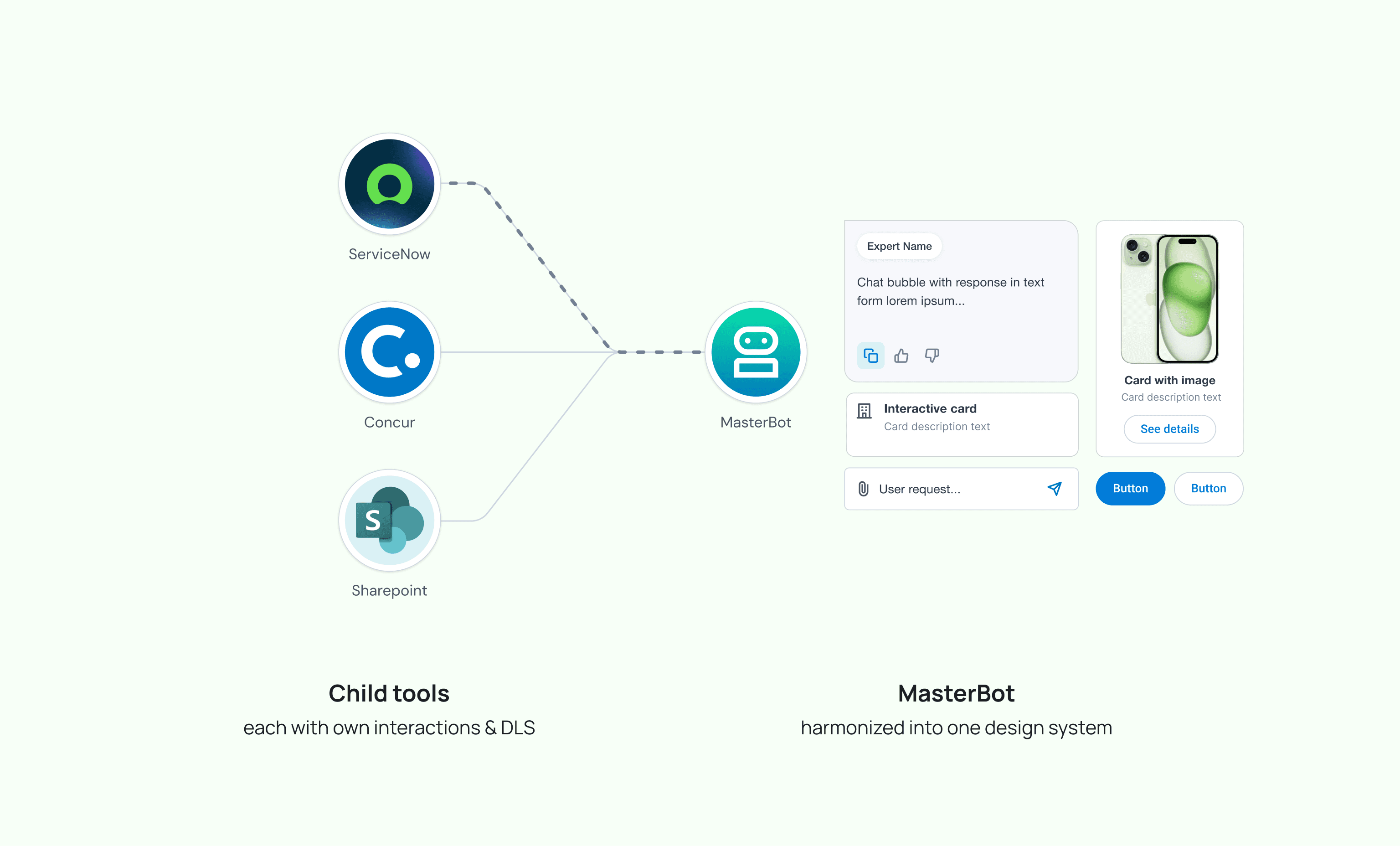 One of the biggest questions was how to visualize MasterBot’s role as a childbot orchestrator (not an all-knowing agent). Bayer wanted employees to understand this mental model in order to highlight the scaleability of the platform. We tested multiple mental models and decided to present connected childbots/tools as domain "experts" that took a secondary position in the UI, but reinforced the concept of MasterBot as an agentic orchestrator.