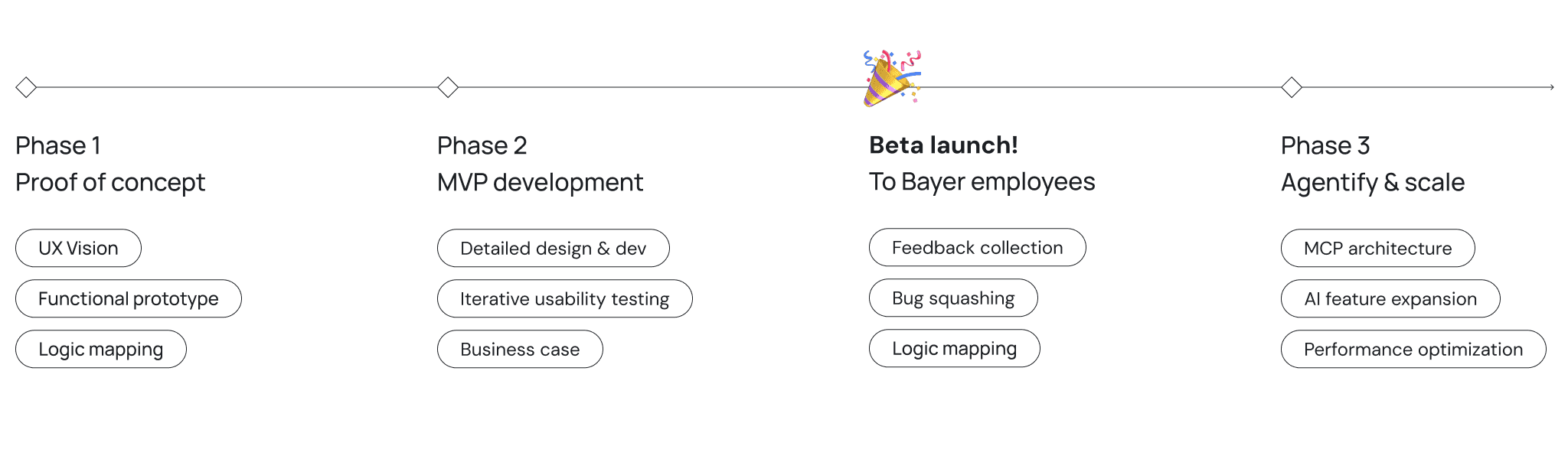We agreed early on that MasterBot should be designed as a scalable framework, not a standalone app, so that teams could continue plugging in new chatbots or tools in the future. We worked with product owners across Bayer to prioritize which use cases to focus on first.