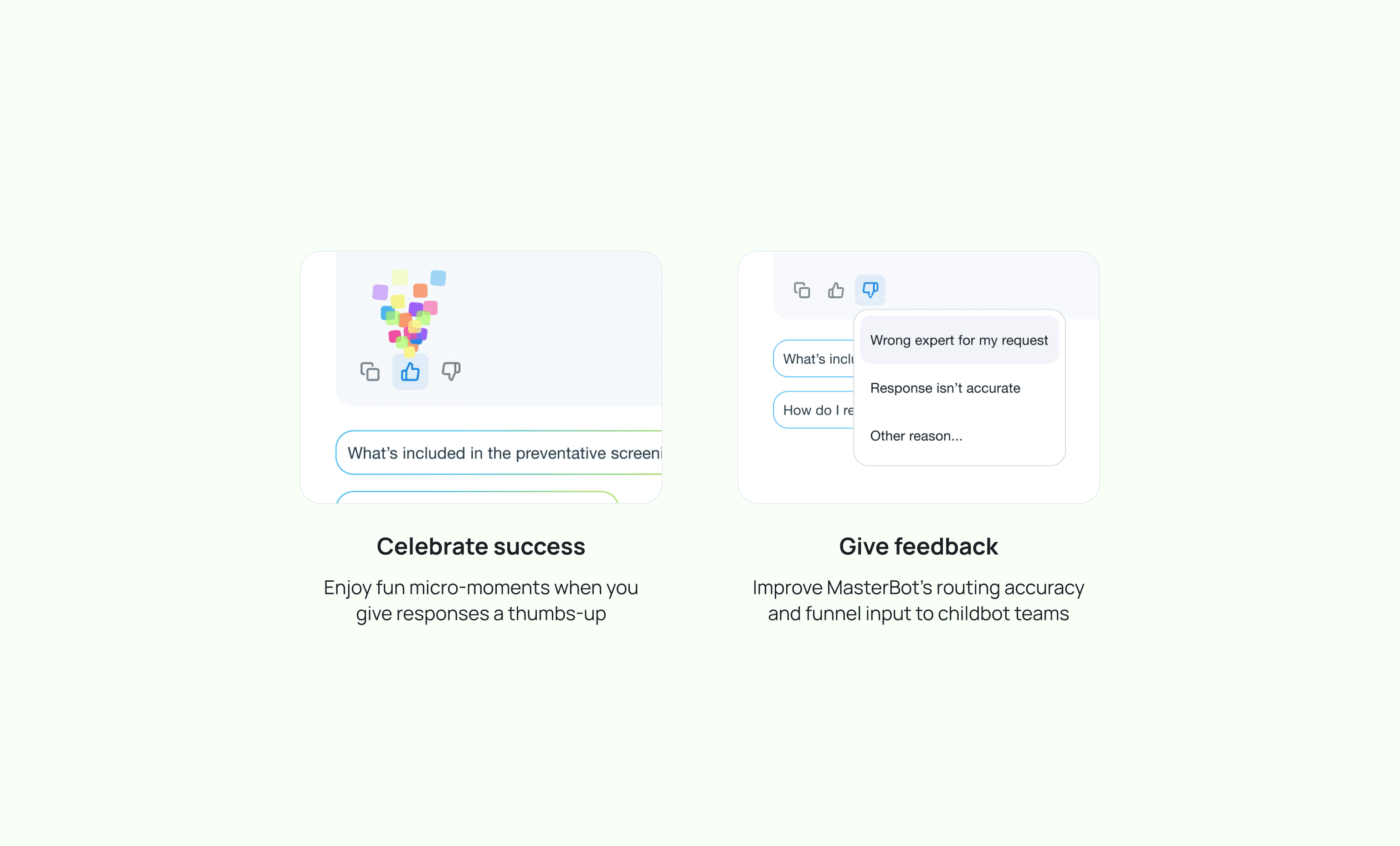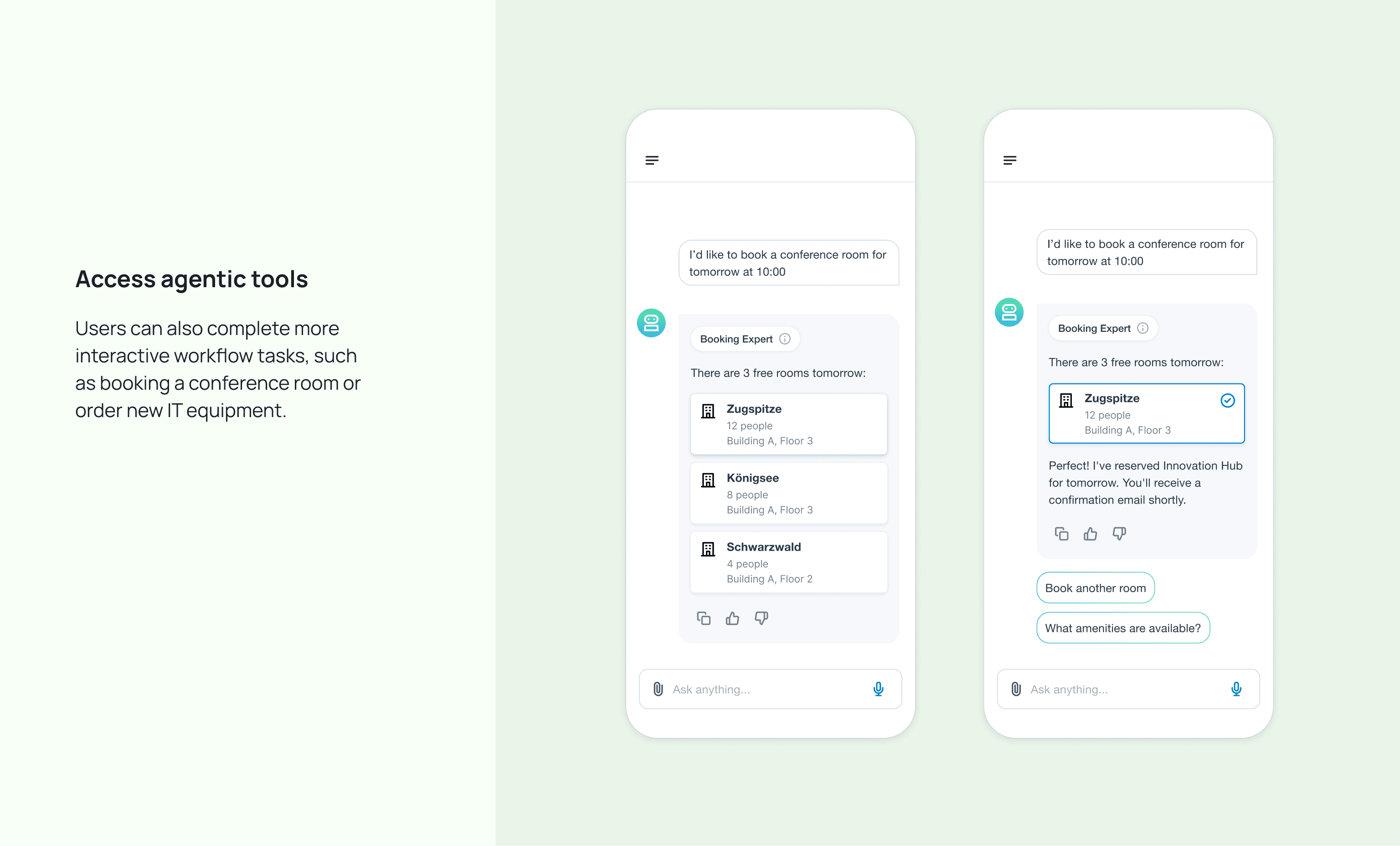 Based on the user’s request, MasterBot decides which “expert” to connect with. This enables employees to jump between different topics in a single chat thread. They can ask questions or actually complete more interactive workflows, such as booking a conference room or order new IT equipment.