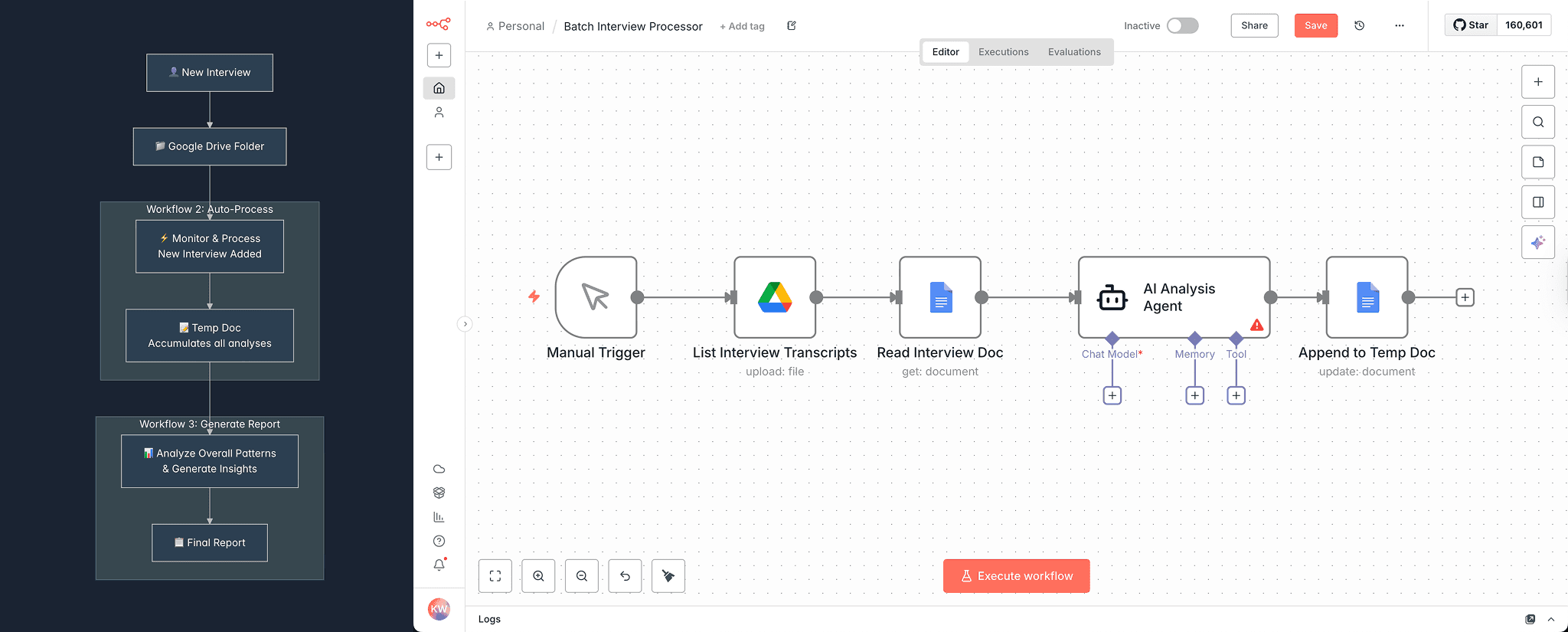 In the later rounds of user testing, we experimented with setting up an agentic automation workflow in n8n to transform multiple user interview transcripts into a draft insights report. When we dropped interview transcripts into a specific Google Drive folder, n8n would automatically analyze all interviews together to identify patterns across participants, and generate a research report draft with key pain points and recommendations.