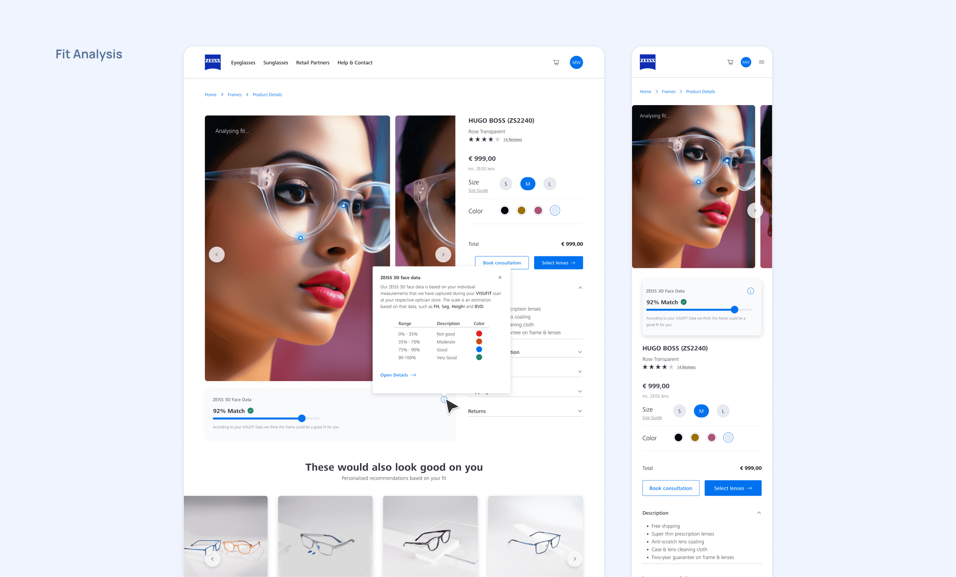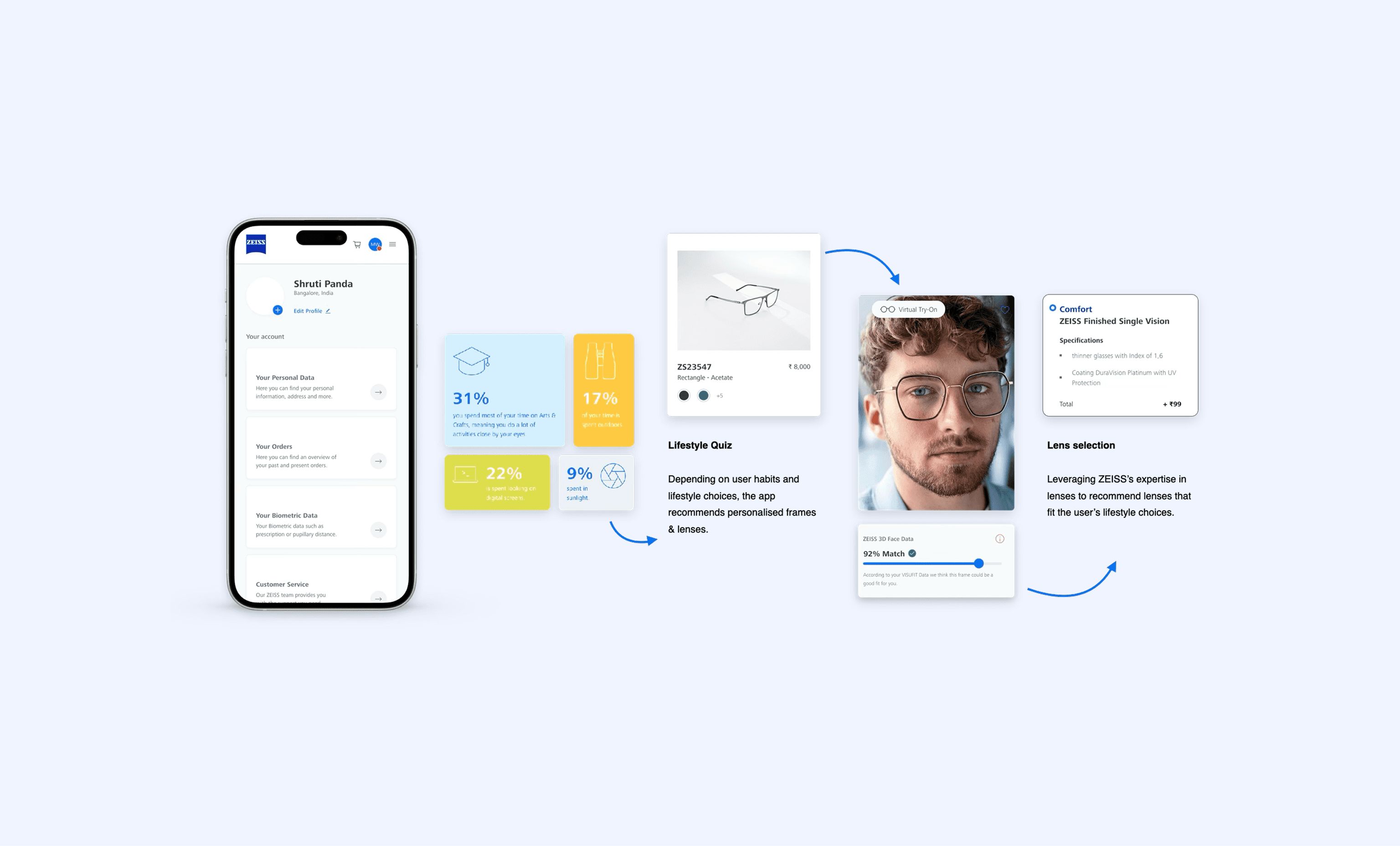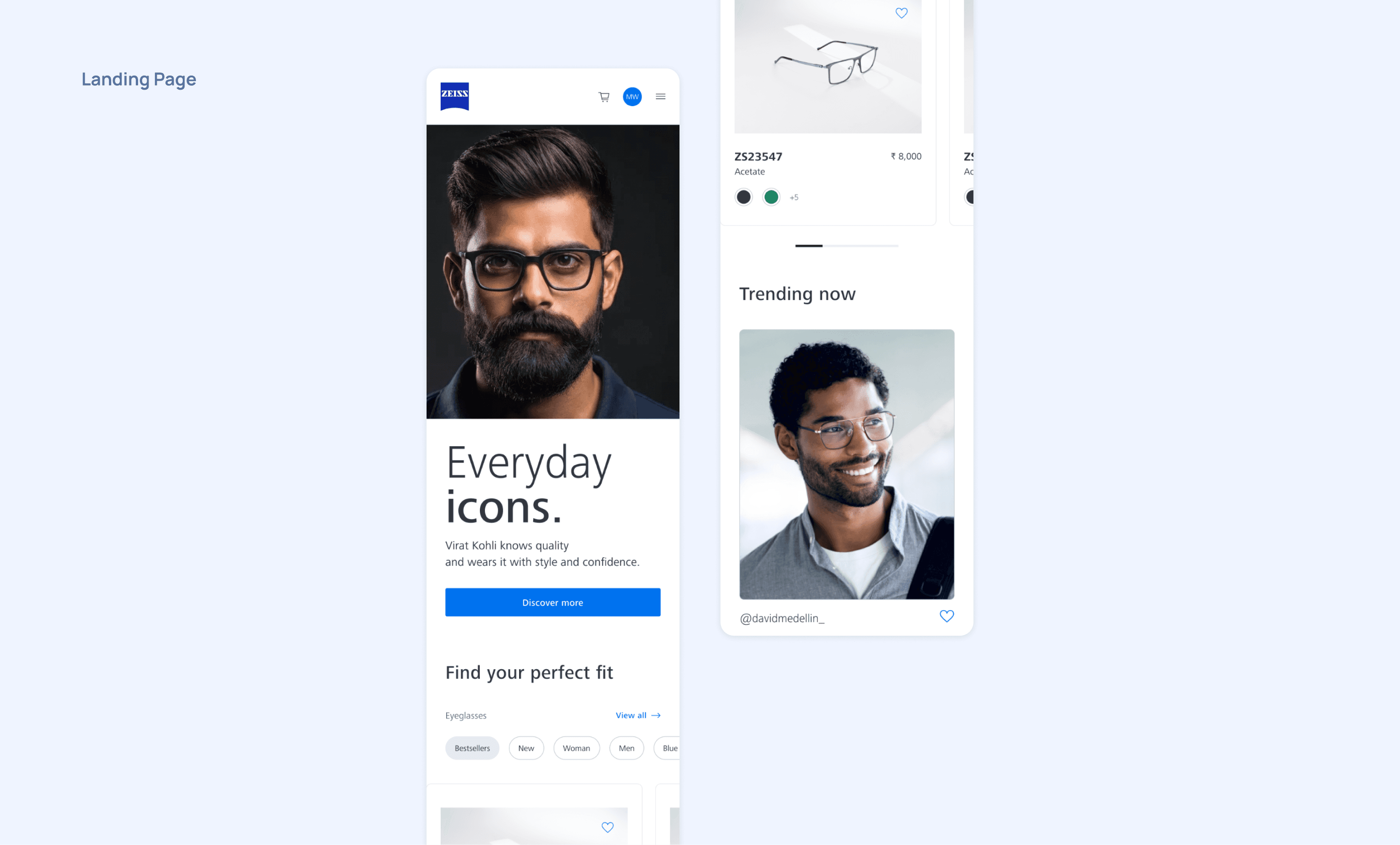 Following the research and concept phase, we helped ZEISS design their first e-commerce marketplace, where they're now selling prescription glasses in India and Brazil. We worked as an embedded design team next to ZEISS's in-house PO and development team.