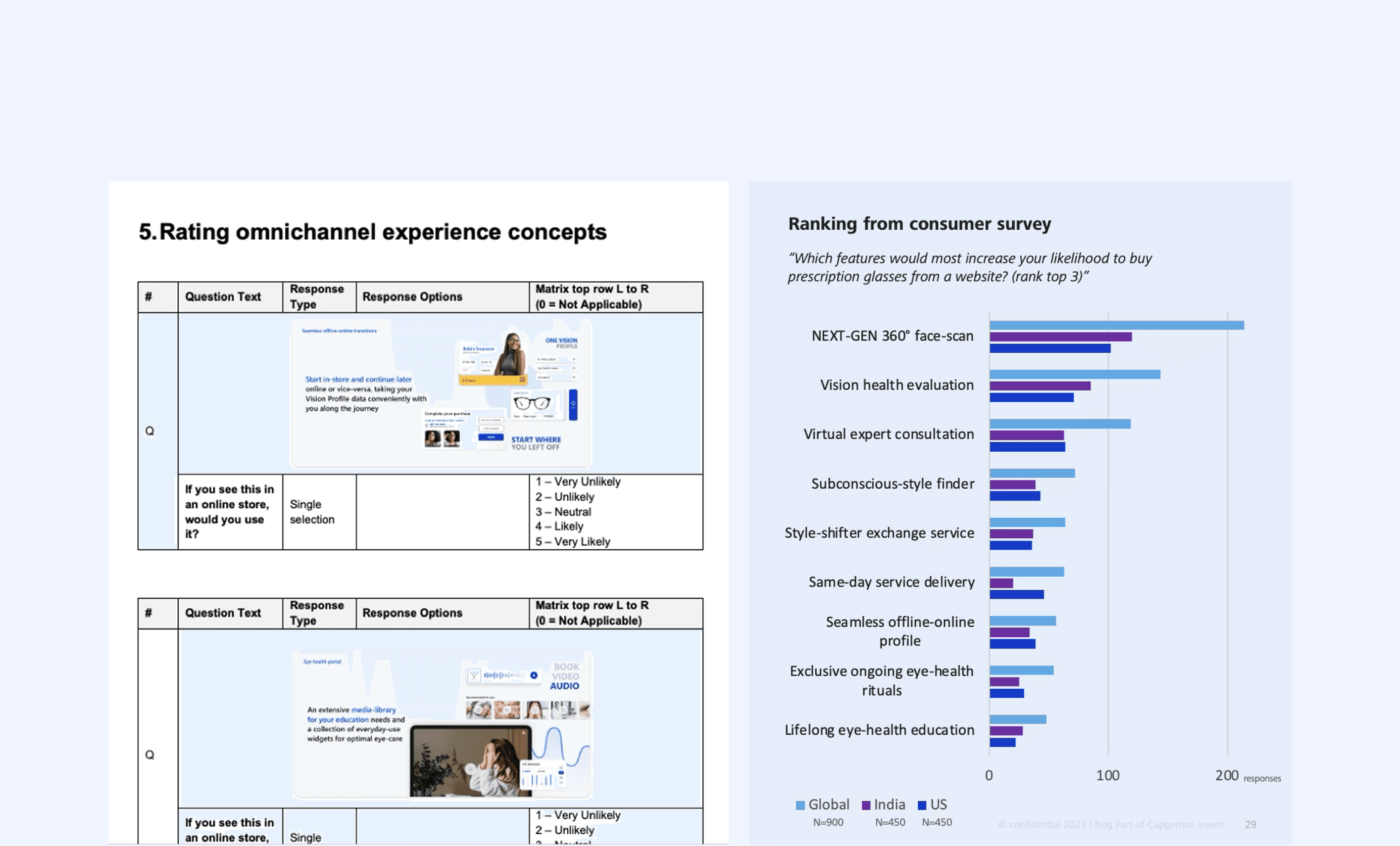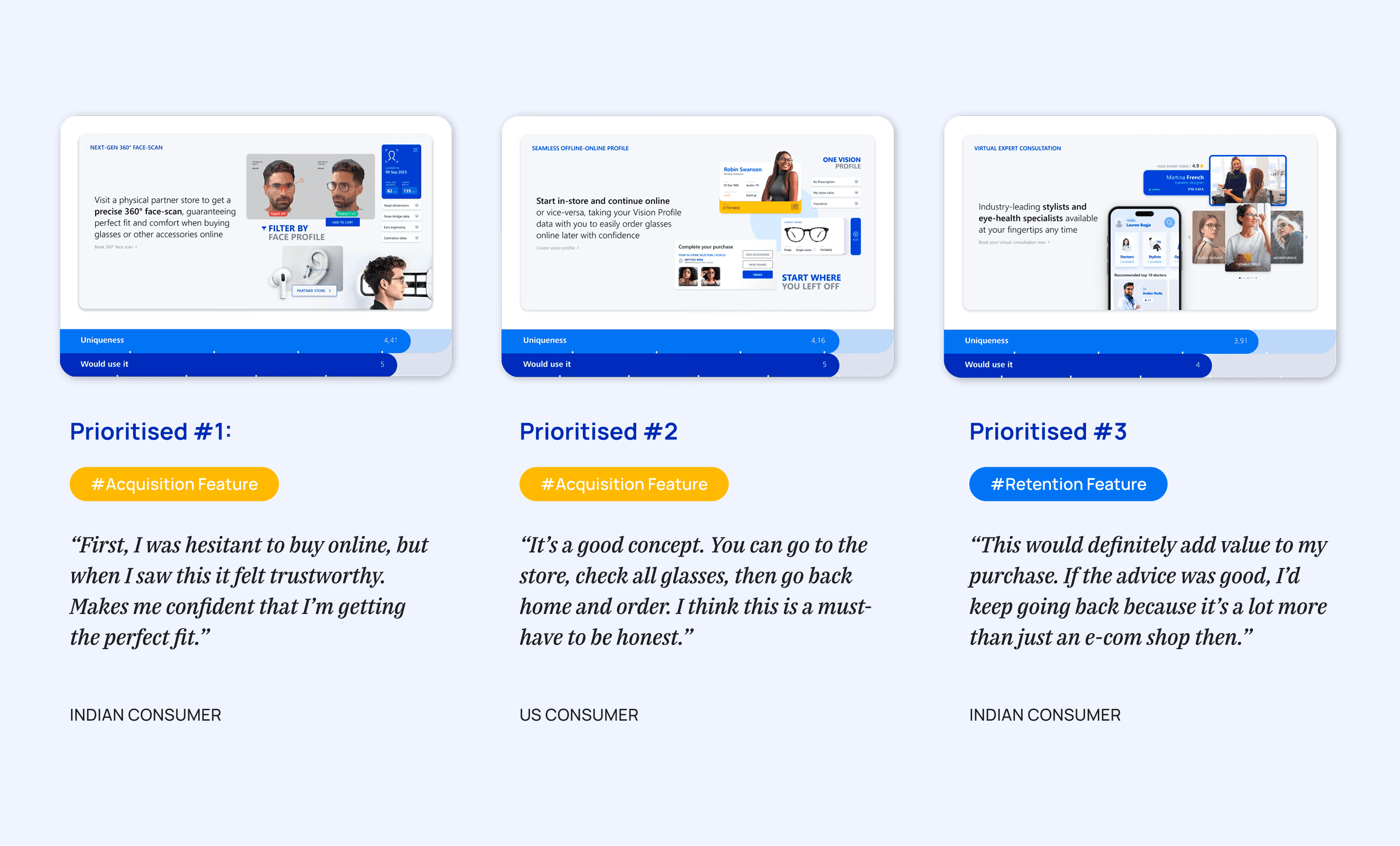 A survey of 450 Indian and 450 US consumers helped us decide which offering concepts to move forward with. The data confirmed what stops consumers from buying prescription glasses online today, and revealed which concepts appealed the most to target consumers in both markets.