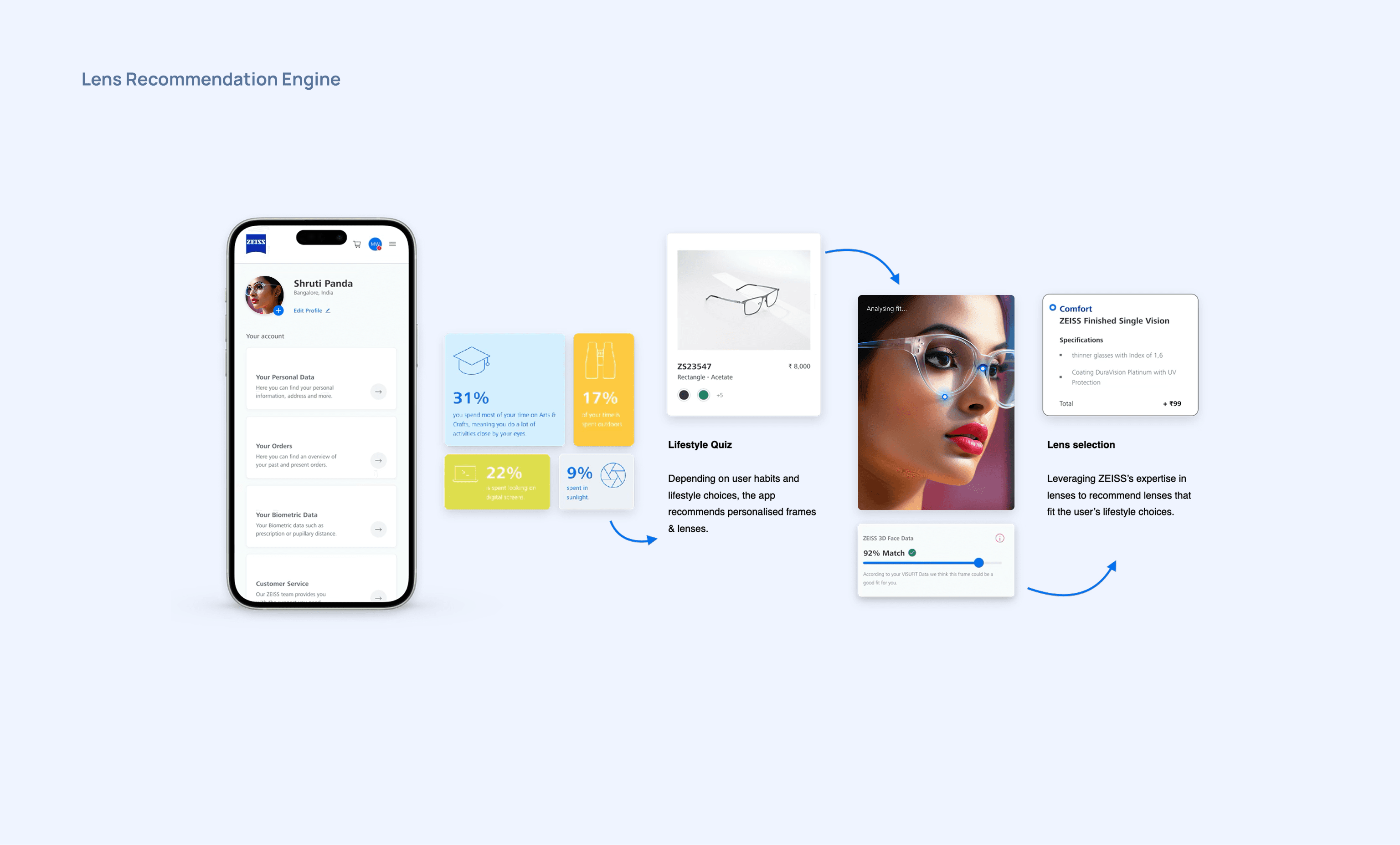In order to give consumers confidence that they were ordering the right glasses, we explored how to leverage data and gamification to give personalized suggestions on which frames and lenses to consider.