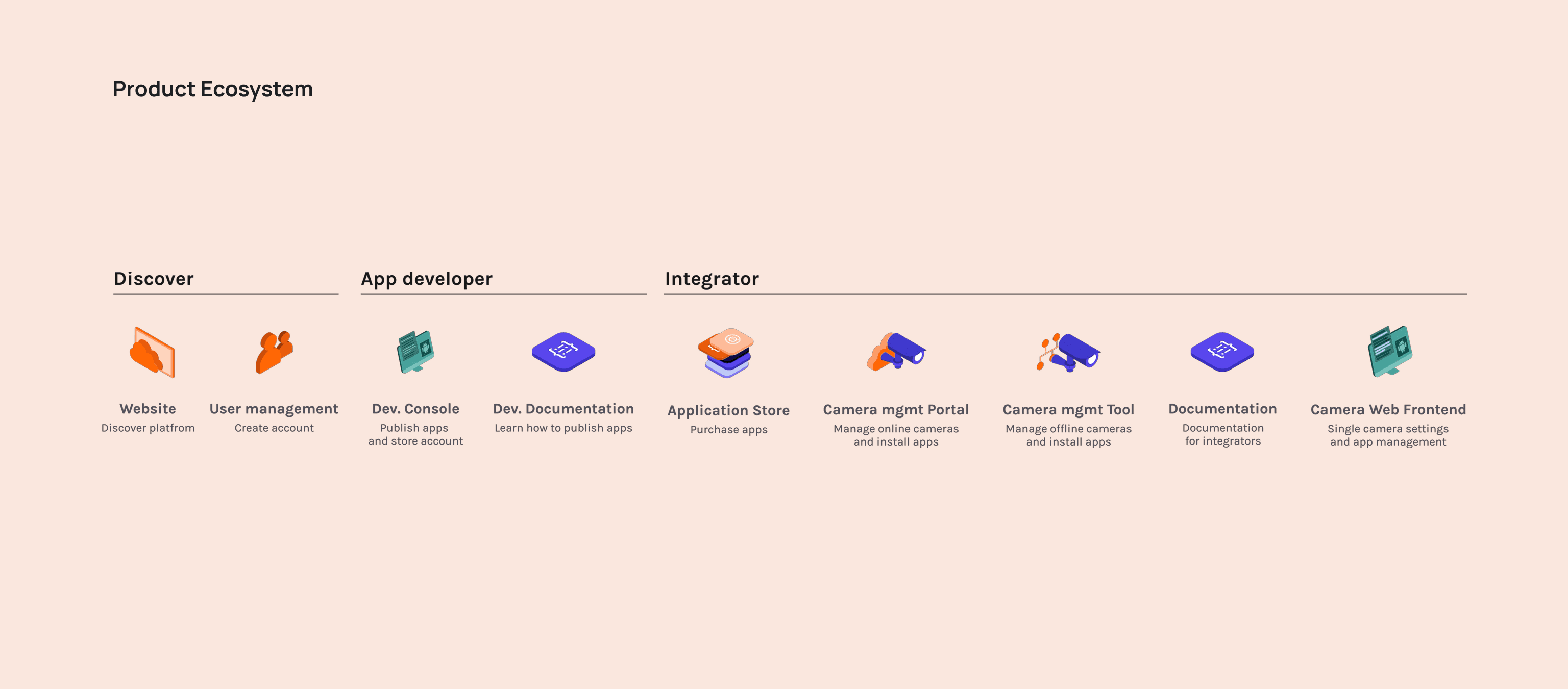 For camera integrators, a single job-to-be-done often spans multiple SAST products. I encouraged the team to map an E2E journey for each main user type to help us zoom out and highlight the biggest gaps or issues. These journeys were also a critical tool for aligning with the SAST product owners on where to conduct deeper usability testing.